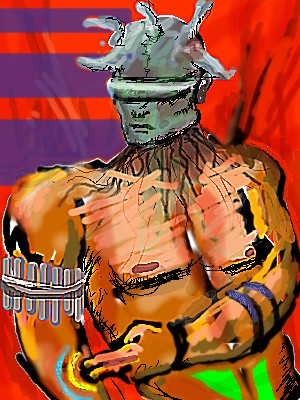this is very interesting and unusual.. I like your splotchy colors and the contrast between the flesh and the helmet head | |||||||||||||||||||||||