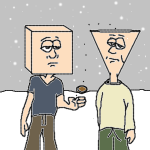 heads or tails.... neither wins, the coin goes up and never comes back down(just drawing a weird toon, don't mind me) sorry about the coloring... I'm tired... I decided, the coin falls into funnelhead, then gets shit back out eventually
