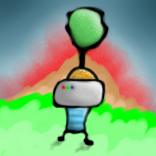 In this picture you can see an odd looking robot. There is also the glowing mountain of pie in the background, along with some grass and a sky.
