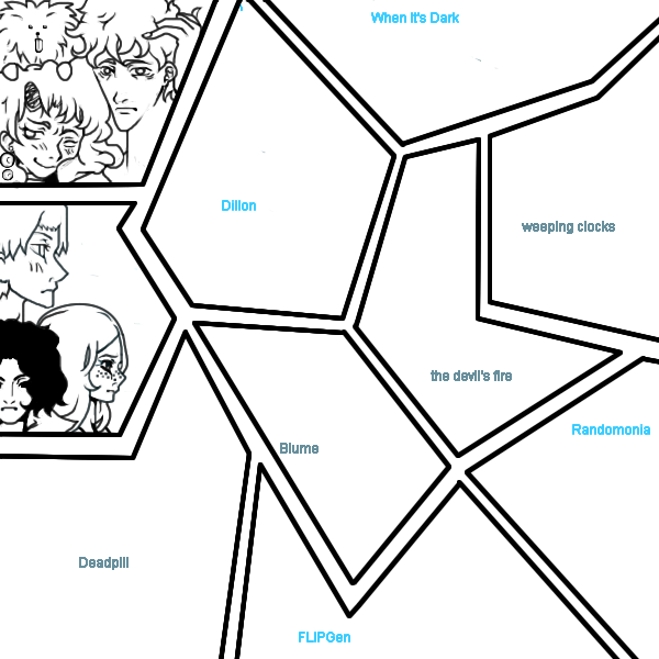 Sorry guys. I didn't even put any of the people in their slots. :'(This is a big ol' picture of a few of my comics/stories. It has slots for each story, ya' see? But my father's kicking me off, and I can't work on it right now. I'll probably have to request more than 5 versions. @_@ |