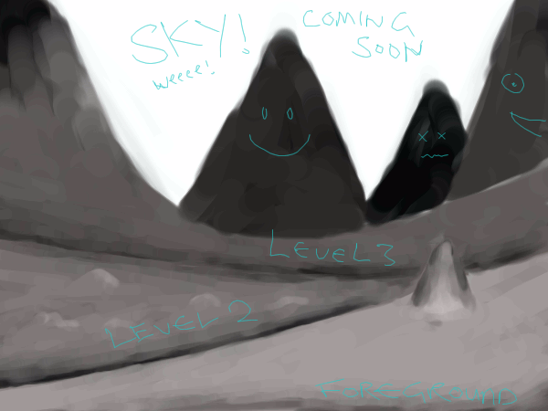 Here's the background layout, guys. Since the canvas is small, i've included 3 depth levels (wow!) on which you can stick your character (keep em' small eh).If you want anything changed then speak out.