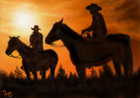 I want to be the saddle of a female rider. >;)I love the composition of this picture! The dark figures in contrast to the rising sun look so nice and realistic. I almost feel blinded by looking at the sun! The subtle dark brown shading inside the black silhouettes make the effect even more realistic. Fabulous artwork. <:) |XOD|