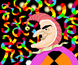 Um, Interesting,Looks like gummy worms in the back. I like how you draw the color for the clown, it's very smooth and soft. nice shading on his face too! |