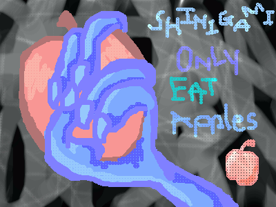 Was bored + Death Note influenced + Feeling over apple-minded (cause of Death Note) = This piece of work..the hand looks crappy, so do the 2 apples.. XD And the backgound.. and well my handwriting..and the shading..