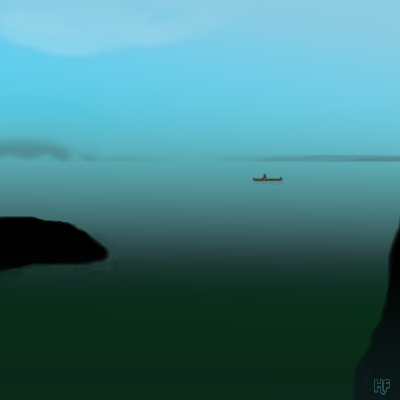 Pretty Helena. If I may suggest, put some soft lines over the lower part of the rock on the left, as it is now it looks like it's floating instead coming out of the water. Some faint water lines following the curve of the rock would set it more in the water and look like a cove. And just a hint of a reflection of the canoeest in the water to place him more on the water as well. I do love the colors you used. It makes it look so mystical.