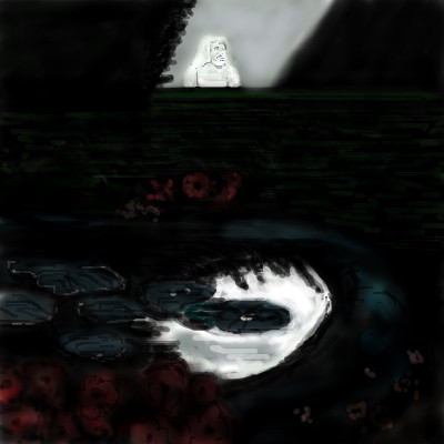 hi dave'its a rooftop garden with a lily pond wid flowers round it'in the background is the head of a statue from below'hope that helps
