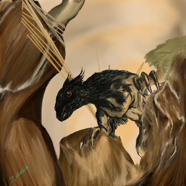 So mad....those lines didn't pop up til I hit save and then it was too late. ....otherwise this creature is sort of an evolutionized idea of a bird...losing it's need for wings developing (well de-evolving?) into more like a dinosaur counterpart. Living in the mountainous area of it's planet (yeah decided it was to be extra-terrestrial ) it is now sentient. |
