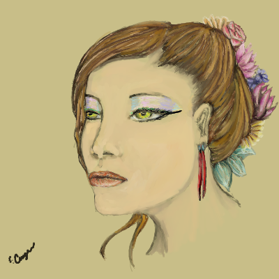 I like the matching of skin tone and background color..and the upsweep of her hair is classic..all in all I think it's quite lovely. |