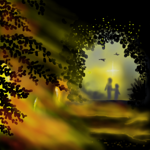 This is pretty! I love the leafs in silouhette and the sunbeams. Course, I gotta say 'brighter'!!! lol!! Nice piece!