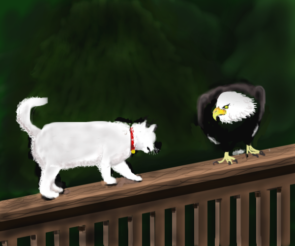 I like this.....I don't think that eagle has to worry about anything.....he looks like he can handle himself quite well....."lol"!! I would advise the cat to turn around and go the other way!!! Cute draw!! :) |