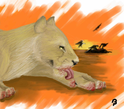For some strange reason, it makes me hungery... mmmmmm wildebeest. The lion needs some darker shadows on her, the voltures looks really good.