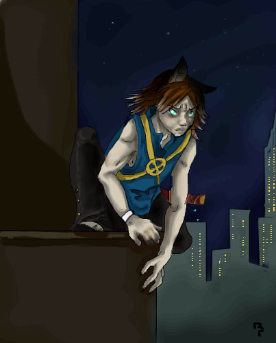 okay, first off, this is (obviously) for the comtest week 20 x-men thing.secondly, i would like to say that half way through i accidently clicked a bookmark button because it was so close to the undo button so i went to a different page. i was able to go back and the comp remembered what i had done, so that was good, but the timer was put back to zero...i started around 11:45 i believe and the time now is going to be 3 in a few secs.... ANYWAY. just wanted to let you all know that the timer is off. okay, so about this guy: his name is stealth..he is alot like a cat, but I did not like the thought of him being known as 'cat man!' or 'kitty boy'...plus i dont know if thats already an x-men... so-since cats are very stealthy animals (quiet and quick) thats why i named him 'Stealth' Powers: no special powers such as fire balls and stuff, but he is very quick. He has a very keen sence of hearing (duh. ears), he can jump, and hes got some claws....yep. so yeah it is kinda a cat man. but an x-cat-man. see? he's got them glowie eyes cause its all dark out...>> weapons: katana and claws ooohhwww maaan. the background turned out like sH897e4r5z. i should stop using the air brush tool for large surfaces... anyway, overall i think i did pretty good, if you think otherwise, PLEASE tell me, i love to hear constructive critisism C: helps me get better. oh and by the way, i love hands O.o missed a few things