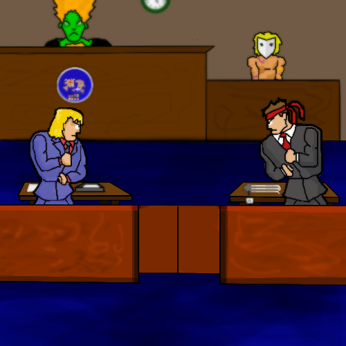 Court Fighter II.Kens on the defense. Ryus there to take him down. Vega on trial for damaging a car in the bonus round. Blankas the judge of course. Taken from Street Fighter II