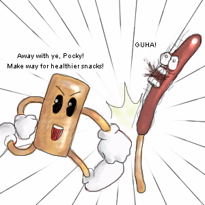 "Guha" indeed! This is great, I dunno why people go all crazy for Pocky. BTW, what's with the cracker's weird accent, "ye"? One more thing... is it just me or is that Pocky phallical (he has a shiny... head)?