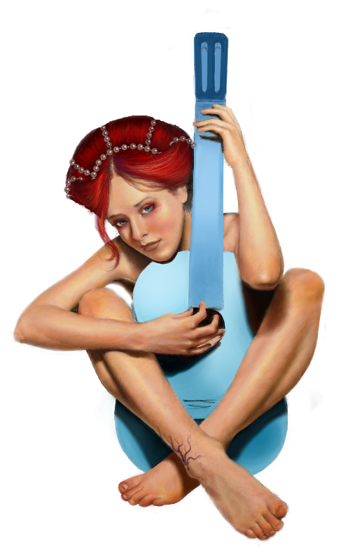 excellent!...although unfinished, there's so much details...i like how you change the color of the hair, you choose a blue guitar...let's play with the colors...