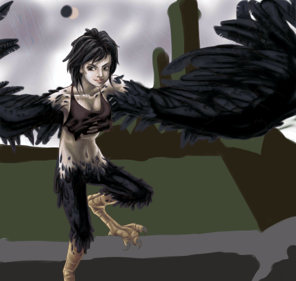 this is turning out nicely! It reaminds me of a harpy picture i did last year in art class.