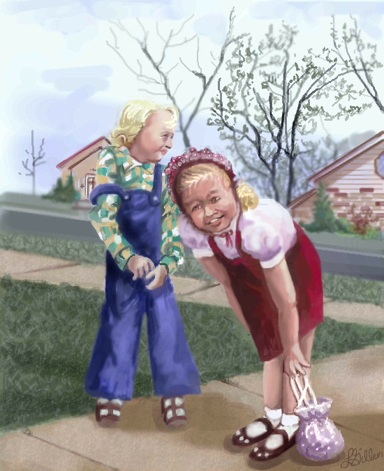 Laura in the red dress with Mary from across the street. This was probabally about 1956 or so.....