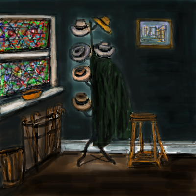 What a nice neat room....no clutter laying around. I wish my room looked this neat!! 'LOL"! I like all those hats too. Very nice draw!! :)