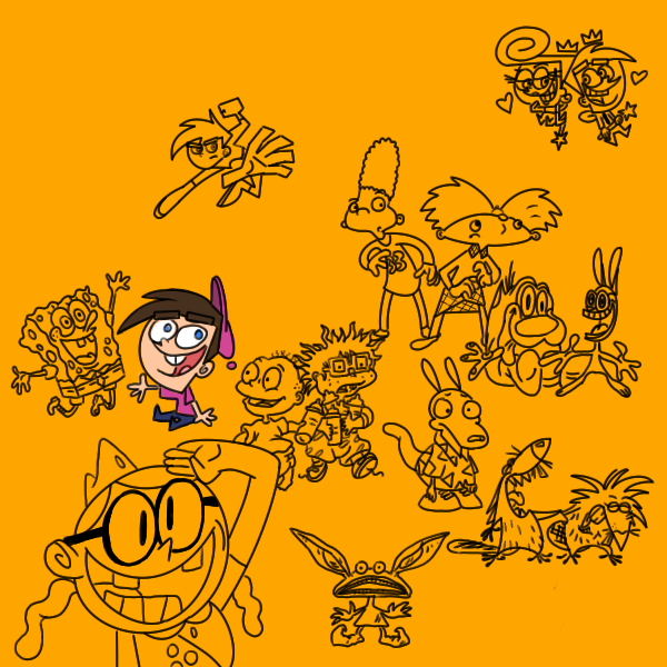 SpongeBob SquarePants (Spongebob) Ren & Stimpy (Stimpy & Ren) Hey Arnold! - (Arnold & Gerald) The Angry Beavers (Norbert & Daggett) Danny Phantom (Danny) RugRats (Tommy, Chuckie) RocKo's Modern Life (Rocko) Fairly Odd Parents (Timmy,Cozmo,Wanda) The Mighty B! (Bessie) AhhHh! Real Monsters (Ickis)