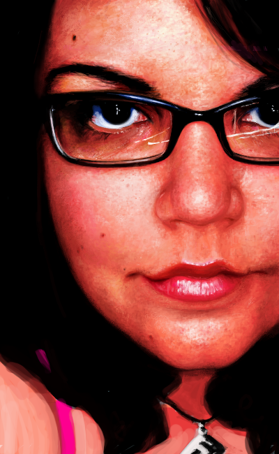 I've looked at this a lot of times and been blown away every time. I just now realized what I like about it most, the way you slightly exaggerated the things a camera does when the shot is a little overexposed and the flash is causing it. How the light shows the details in the skin in a way normal vision would never pick up on. And the corona of color around the iris. And the way the hues of the skin tones are uniformly off. It's a great painting of a 'bad' photograph. That and the killer cupid's bow mouth.
