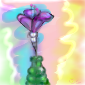 Sits on my computer desk in a little green bottle; a little bent out of shape from being stepped on, but I enjoy its relentless cheerfulness.Wasn't flower powery enough ... needed some grooviness :)