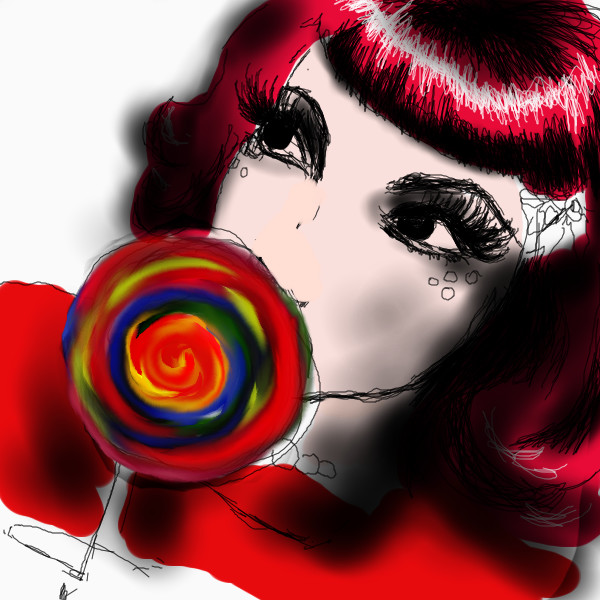 To me when i look at the eyes and hair..it's got this pin up feel to it...I like the bold colors and that lollipop looks delicious....