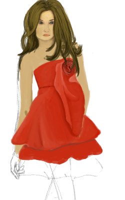 I agree.....her arm looks a bit too long, but her face and hair look good, and the red dress is very nice. :)