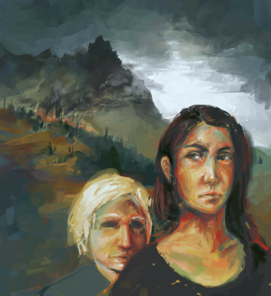 a very mysterious painting... the looks on the faces are kind of unsettling, and of course the fire off in the distance is too... but the combination of your talents is great, it's well done so far
