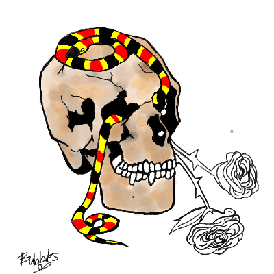 I like it colored "bubbles".....you did a nice job on this. That looks like a coral snake crawling thru the skull. I like the way you colored the skull......now are you gonna color the roses?? Great draw!!! :)
