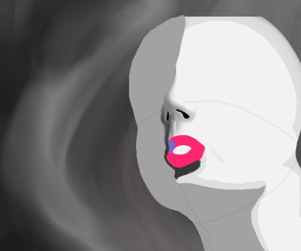 she looks like she's blowing smoke or blowing out a candle or something....maybe go with that and have her blowing at a bubble floating in the air? Love those glasses btw! =)