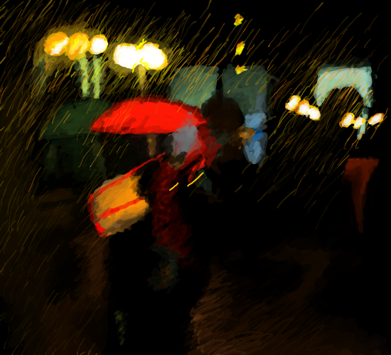 This is interesting :D It looks to me like you're looking in at a tavern through a window on a rainy day. Very cool :)