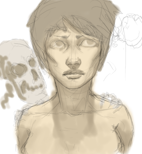 This is cool. She looks like she's afraid of something. I like the idea of version two, with the skull and everything. :) I think her eyes are the best part, though. :D