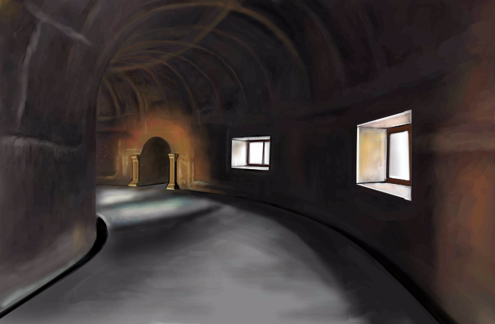 When are you gonna finish this flubadub?? There is something kinda spooky about this......I can picture ghosts floating thru these halls.....or maybe this is where Count Dracula lives, and he sleeps during the day......and when night falls.....he wakes up in his coffin, and he's very hungry for some fresh blood, and he goes out to "feed"....."lol"!! All kinds of eerie stuff can be happening in this draw.....I'm anxious to see how you finish it!! :P