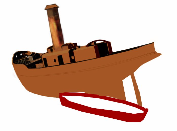I hope nobody has restored it since the picture was taken, it looks much better rusty, it had a number on the side of the boat so i might try and look it up.I just want to add that the only thing we used from the original photo was the tug itself and the little boat.