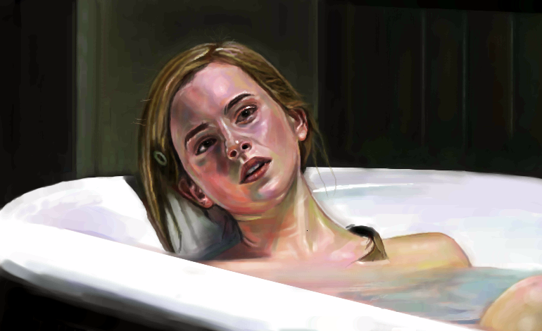Let me guess. The hair on her shoulder and the water?