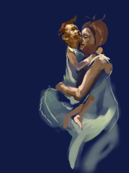 maybe it's a baptism or something..or maybe the child jumped in and the mother is saving said child...or maybe theyr'e just going for a swim...you know back in the old days they swam in these sort of slip dresses..as wasappropriate for that time...whatever the reason..it's coming out wonderfully..