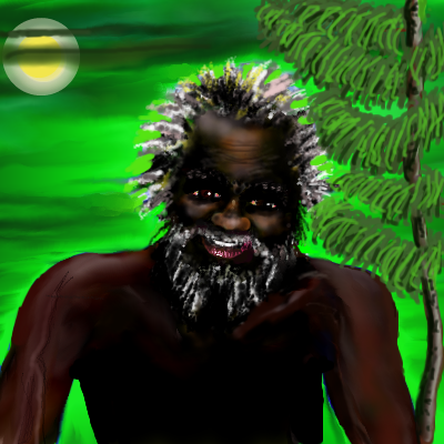 This is cool.....I like it.....I also like the glowy green background in the first version. He looks like a genuine aboriginie!! :) Now it looks complete.....the addition of the tree and the moon, and that green glowy background really set it off.....nice job!! I luv it!! :)
