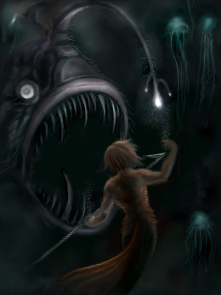 I just felt like trying a "merman" draw.....it's something a little different from the usual "mermaid" draws...."lol"! I still need to work on this more.....I'm still not satisfied with it. I don't know how that "merman" thinks he is going to battle that huge ugly fish with that spear....I think he is gonna end up as "lunch" for that fish....."lolz"....:) I'm posting this as "finished", cuz I don't feel like working on it anymore at this time.....but I do plan on finishing it later.....I just feel like starting on something different to draw....this one took me quite awhile to draw, and I'm not in the mood to do anymore to it right now.....thanks for all of your comments....I will finish this later.....:)