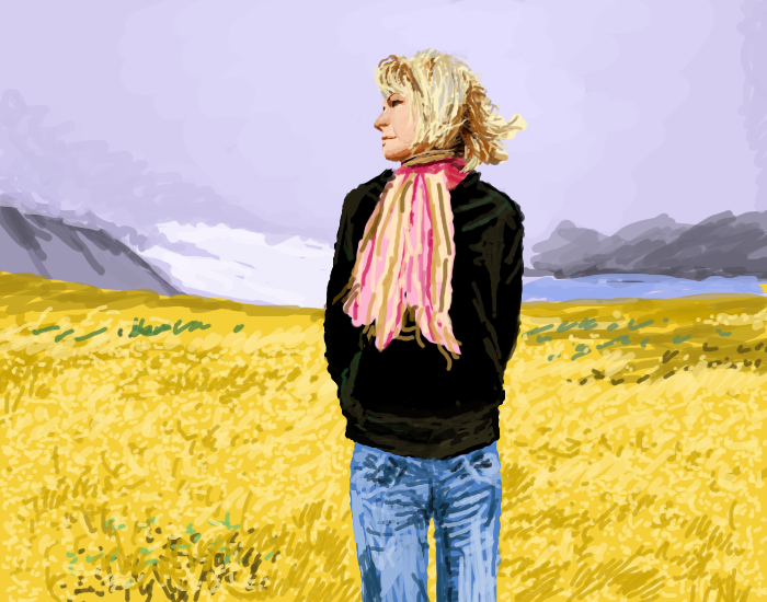 Love the jeans, the mountains, the sky, the grass... and it's like pointillism only with lines. Cool style.