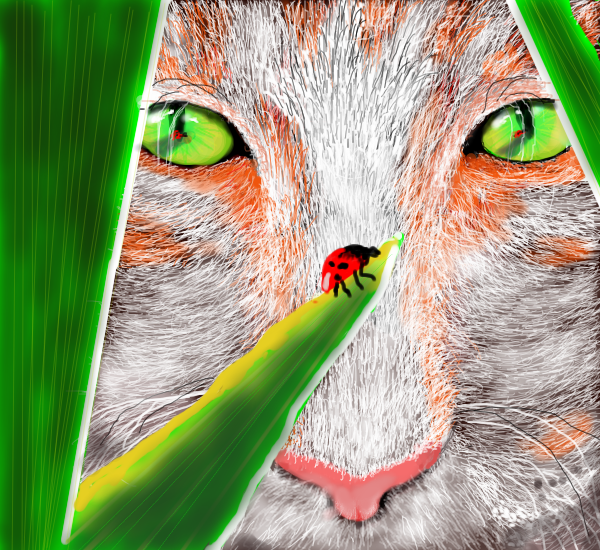 I hope he's not gonna eat that ladybug......."ladybug", "ladybug".....fly away home.....the cat's gonna eat you, and your children will be all alone......"lol"!!