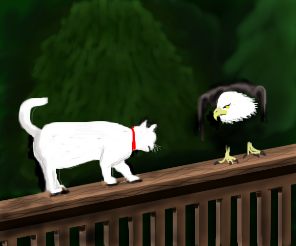 I like this.....I don't think that eagle has to worry about anything.....he looks like he can handle himself quite well....."lol"!! I would advise the cat to turn around and go the other way!!! Cute draw!! :)