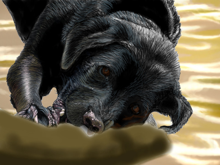 | Showcase entry! elly (Apr 28, 2010)Meet Harley, an English black lab. He belonged to a very close friend of mine who just had to put him down this past Tue. The poor fella was ill with cancer and his quality of life had dwindled to near nothing. What a very, sad, sad day/week this has been for his family & friends =( This dog, like so many others, was very unique! His fav past time, when he wasn't sleeping, was to literally carry a very large, black tire around in his mouth with his two front legs inside it as he walked. This brute could even carry a tire coming out of the water while it's filled to the brim! When he'd get tired of carrying it, he'd lay it down and begin his routine of circling around and around it while licking the tire walls, making them shine as good as any armor all could! Harley also loooooved to play fetch! When his 'daddy' wasn't throwing his favorite, soggy, slobbery tennis ball for him to chase, he'd throw, not a stick, but a thick branch, as thick as someone's lower leg! Much like this one in my drawing. And we're not talking 1 or 2 ft in length either. It was more like 5 or 6 ft long usually! His daddy would throw it into the Chattahoochee River here in GA and Harley would swim out to get it and bring it all the way back to dad. When he was finally tired of that, he'd lay down in the edge of the water and begin to make mincemeat out of it! That's what he was doing the day this photo was taken, this past summer. Harley was a 'huge statement' in his family and among his family's friends, who will be missed more than anyone will ever realize! I wanted to do something special for my friend, his 'mommy' so when I found this picture, I decided I'd pour everything possible into this drawing! Even while sick, since I came down with something yesterday =(. It's all worth it tho.....I will have this printed and framed for my friend =) Although a very challenging drawing, I enjoyed drawing it more than I knew I would! RIP my gorgeous friend, Harley! I love you! =)