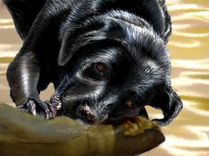 Meet Harley, an English black lab. He belonged to a very close friend of mine who just had to put him down this past Tue. The poor fella was ill with cancer and his quality of life had dwindled to near nothing. What a very, sad, sad day/week this has been for his family & friends =( This dog, like so many others, was very unique! His fav past time, when he wasn't sleeping, was to literally carry a very large, black tire around in his mouth with his two front legs inside it as he walked. This brute could even carry a tire coming out of the water while it's filled to the brim! When he'd get tired of carrying it, he'd lay it down and begin his routine of circling around and around it while licking the tire walls, making them shine as good as any armor all could! Harley also loooooved to play fetch! When his 'daddy' wasn't throwing his favorite, soggy, slobbery tennis ball for him to chase, he'd throw, not a stick, but a thick branch, as thick as someone's lower leg! Much like this one in my drawing. And we're not talking 1 or 2 ft in length either. It was more like 5 or 6 ft long usually! His daddy would throw it into the Chattahoochee River here in GA and Harley would swim out to get it and bring it all the way back to dad. When he was finally tired of that, he'd lay down in the edge of the water and begin to make mincemeat out of it! That's what he was doing the day this photo was taken, this past summer. Harley was a 'huge statement' in his family and among his family's friends, who will be missed more than anyone will ever realize! I wanted to do something special for my friend, his 'mommy' so when I found this picture, I decided I'd pour everything possible into this drawing! Even while sick, since I came down with something yesterday =(. It's all worth it tho.....I will have this printed and framed for my friend =) Although a very challenging drawing, I enjoyed drawing it more than I knew I would! RIP my gorgeous friend, Harley! I love you! =)