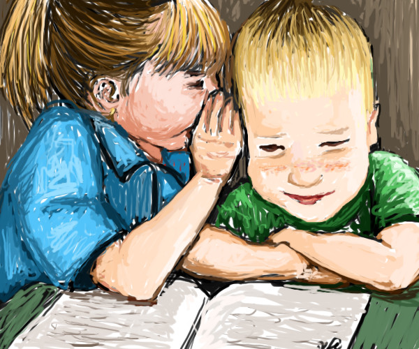 nicely done, her brother is smiling because it tickles his ear when she whispers into it