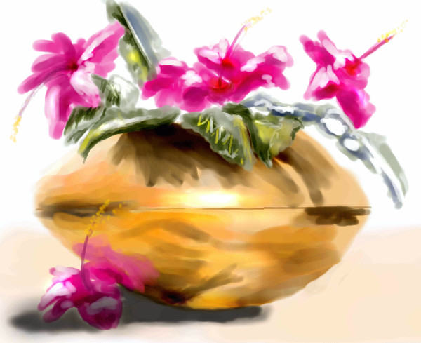 Wowser. I think the flowers look great. They look like cyclamen? To use the Bezier tool to draw a continuous curve, click, drag, let go...then you can click and drag it in two places to make the curve. If you click, and then click again without dragging (like you would to use a line tool), you just get this weird tear drop shape. Your shiny metal FX on the brass pot are beautiful!!!