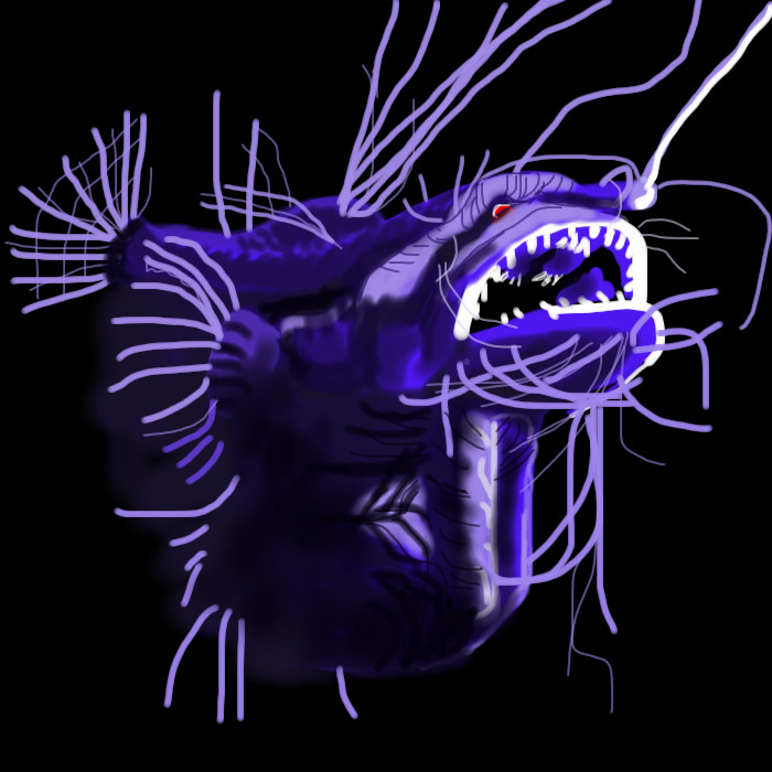 I think the name of the fish is an "angler" fish......I did a draw of an angler fish awhile back.....it's in my gallery. I like the way those fish have their own "built in" light...."lol"! This is a really cool pic pawillie....:)