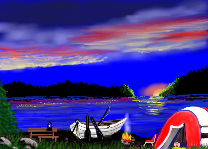 I love the colors in this!!! Great draw pawillie.....and I love that cool looking tent, and of course, that boat. I'd like to be camping out there.....so peaceful looking.....:)