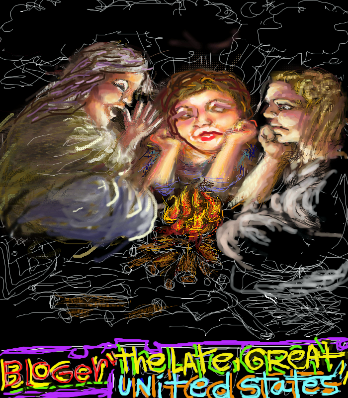 this is just the start of my pic. history picture,a huge outline of "the late great united states"It's not finished,it needs a campfire between the 3 people,but I'm not doing any more on it.Let the US end without me.Or,the world,for that matter.