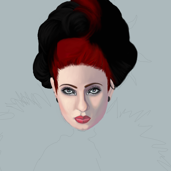 Very nice! The REDS are awesomely brilliant and I love the effect you used for the tule netting on her collar....so many other details catch my eye as well! Very nice work!