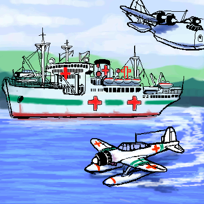 (http://www.jrc.or.jp/english/index.html)(http://www.nyk.com/rekishi/exhibitions/event/index.htm) I paint Red Cross Society Ship "HIKAWAMARU". This ship rescue any country soldiers in World war. Hospital water-plane is my idea. Hospital water-plane is not history. Thank you. I want to more times for this paint..... This hp is Japanese hospital area. (http://www6.airnet.ne.jp/manyo/main/) This hp is non-battling field area. (http://www.kamnavi.net/)